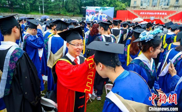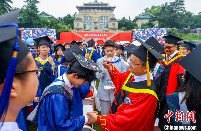 6月20日上午,武汉大学2024年毕业典礼在该校九一二操场举行。12000多名毕业生齐聚一堂,共同见证这一难忘时刻。图为武汉大学校长张平文(右)为毕业生拨穗 。中新社记者张畅摄
