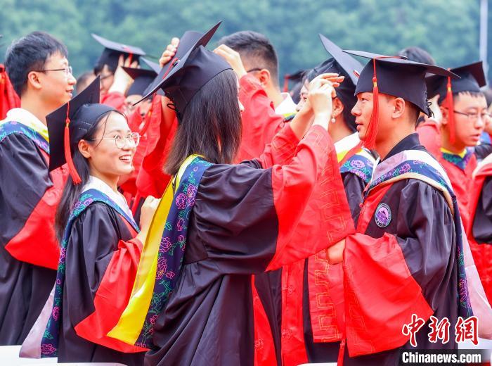 6月20日上午,武汉大学2024年毕业典礼在该校九一二操场举行。12000多名毕业生齐聚一堂,共同见证这一难忘时刻。图为毕业生互相整理衣冠。中新社记者张畅摄