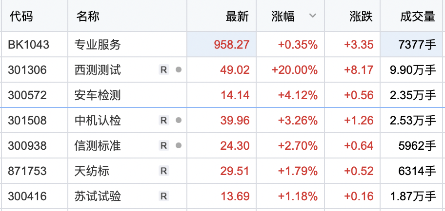 上证报中国证券网讯 6月3日早盘,专业服务板块异动拉升。截至9时46分,财盛证券西测测试20cm涨停。安车检测涨超4%,中机认检涨逾3%。